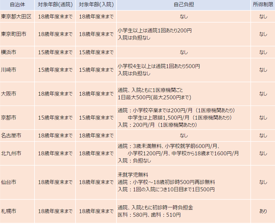 主な自治体の子ども医療費助成制度をまとめてみました。